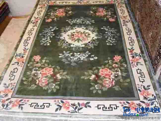 顏色及圖案:綠色地,粉色、白色花紋圖案手工編織真絲地毯。