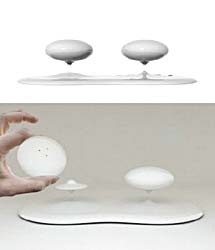 這其實(shí)是一只磁懸浮調料瓶,它的整體被設計成白色,共有三個(gè)部分:調料瓶、底座與基座。兩個(gè)橢圓形的調料瓶被安放在磁體支撐的小巧底座上,而這兩個(gè)小巧的底座通過(guò)與基座之間的磁力作用懸浮在空中從而起到對調料瓶的支撐作用。