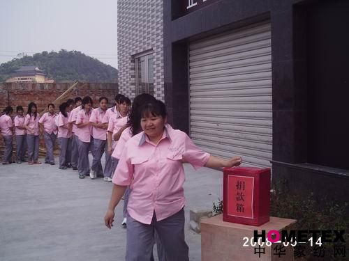 “伸出我們的雙手,獻出我們的愛(ài)心吧”。溫爾思家紡全體員工都以實(shí)際行動(dòng)全力支持了此次募捐活動(dòng)。全體員工排成長(cháng)長(cháng)的縱隊,以自己的方式,用自己的一片愛(ài)心為受災人民提供援助,幫助四川汶川縣災民度過(guò)難關(guān)!也響應了溫爾思“溫情暖萬(wàn)家,關(guān)愛(ài)澤天下”的企業(yè)宗旨,關(guān)愛(ài)澤天下”作為企業(yè)宗旨的私營(yíng)企業(yè),溫爾思家紡發(fā)起倡議,建議向四川地震災區捐款。