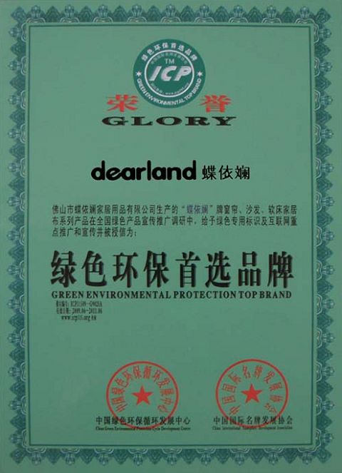 “蝶依斕”牌窗簾、沙發(fā)、軟床、家居布藝系列產(chǎn)品,經(jīng)中國國際名牌發(fā)展協(xié)會(huì )、中國綠色環(huán)保循環(huán)發(fā)展中心進(jìn)行的全國市場(chǎng)調查評定,認定質(zhì)量穩定、信譽(yù)保證、居家環(huán)保,被授予“綠色環(huán)保首選品牌”榮譽(yù)稱(chēng)號。